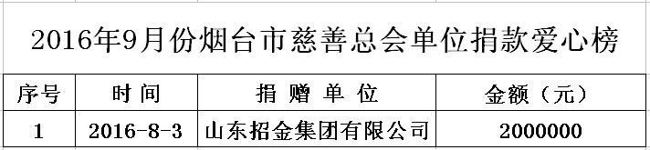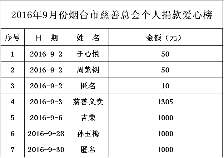 2016年9月,烟台市慈善总会共计接收社会各界捐款明细如下: